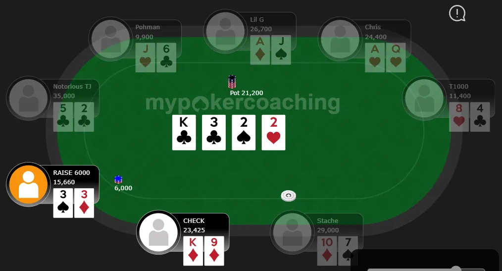 河牌:9♣。公共牌定格为K♣3♣2♠2♥9♣。