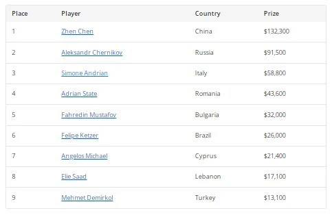 Mehmet Demirkol,进入决赛桌时的记分牌最少者,在他的口袋10遇到Simone Andrian的口袋Q后首先出局。不久之后,陈真通过一次及时的价值下注首次取得记分牌领先,为他的主导表现定下了基调。