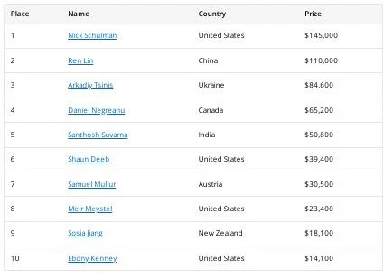 Schulman仅用几手牌就锁定了胜局,从一开始就扩大了领先优势。在最后一手牌中,Ren Lin只剩下不到十个大盲,他用Q-8全下对抗Schulman的A-K,后者最终胜出。