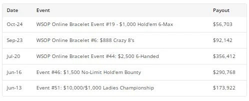 Foxen可能在赢得WSOP主赛事金手链的尝试中失败了,但WSOP的成功将在三个月后到来。在线上,她赢得了赛事#17:500美元Pot-Limit Omaha神秘赏金6-Max,赢得了20,064美元(外加19,207美元的赏金),使她成为五次WSOP冠军。