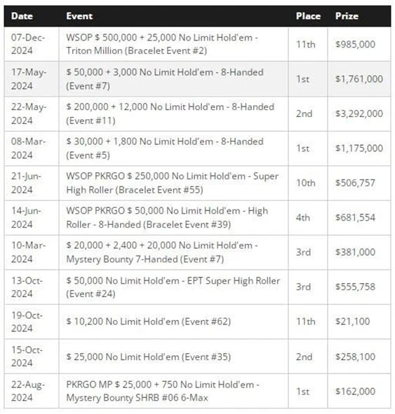 他在2024年还有另外两个7位数的奖金和3个冠军头衔。以下是他在2024年最引人注目的成绩: