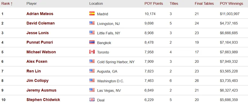 Adrian Mateos在2024年的扑克大赛中以卓越的成绩荣登收入榜首。在年末的最后一个月,他超越Patrik Antonius,并在包括Alex Foxen、Daniel Dvoress、Seth Davies和主赛事冠军Jonathan Tamayo在内的激烈竞争中脱颖而出。