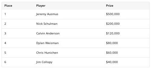 Hunichen在与Anderson的一手关键牌局中,输掉了大部分记分牌,随后没过几手牌便黯然离场。而Weisman对记分牌领先优势的掌控也在几个关键节点被打破,其中最为关键的一次是他用A – Q输给了Ausmus的K – Q。在另一场至关重要的对决中,Weisman拿着口袋7全下对抗Anderson,但Anderson的A – 5在翻牌和转牌都神奇地击中了牌面,使得决赛桌的局势瞬间变为三强争霸。