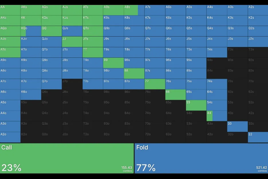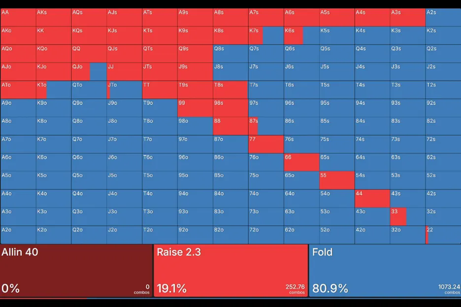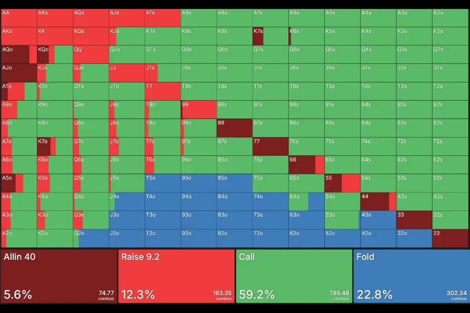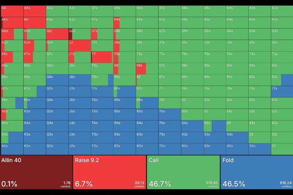 如果你对解算器不太熟悉,这就是每一手牌对抗按钮位开池的玩法。蓝色方块代表弃牌,例如我们总是弃掉不同花色的A2。绿色方块代表跟注,粉色方块代表加注,而深红色方块代表全下40个大盲注。