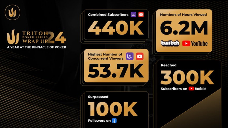 回顾2024年,Triton扑克的直播见证了诸多标志性瞬间。在YouTube和Twitch平台上,“Triton Million Bahamas” 的最高同时观看人数突破5万,Instagram粉丝数量超过10万,YouTube订阅者更是多达30万,Triton社区迎来了前所未有的蓬勃发展。