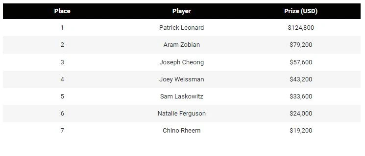 Patrick Leonard重返PGT决赛桌,并经历了一场跌宕起伏的激烈角逐。最终,他在单挑中战胜Aram Zobian,一举夺得赛事#2:5100美元无限注德州扑克的冠军,收获124800美元奖金以及250 PGT积分。