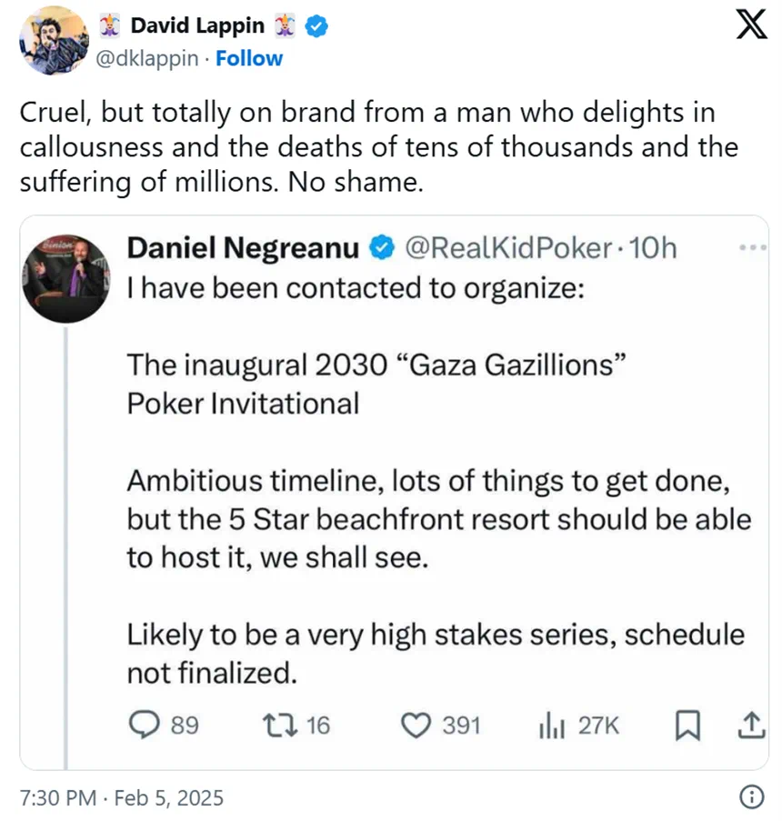 近日丹牛在Twitter上提议在加沙地带举办名为“加沙 Gazillions”的高额扑克系列赛,引发广泛争议。这一提议被认为是对巴勒斯坦人民苦难的漠视,激怒了众多扑克玩家和公众。丹牛的提议与美国总统特朗普的“中东里维埃拉”计划不谋而合,该计划旨在将巴勒斯坦人驱逐出加沙地带,由美国接管并开发该地区。