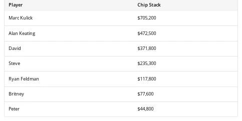 尽管Kulick赢得了他和David之间的边池,但100600美元的主池仍然需要完整的牌面来决定,因为Britney的手牌仍在竞争中,两位玩家同意两次摊牌。第一次摊牌的河牌没有改变任何局面,但第二次摊牌的河牌让Britney提升为赢家,她赢得了17100。