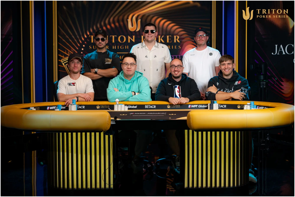 Triton黑山站赛事# 5 决赛桌选手(从后排左起顺时针):Jamil Wakil、Jesse Lonis、Nick Petrangelo、Dominykas Mikolaitis、Barak Wisbrod、Danny Tang、Dan Dvoress