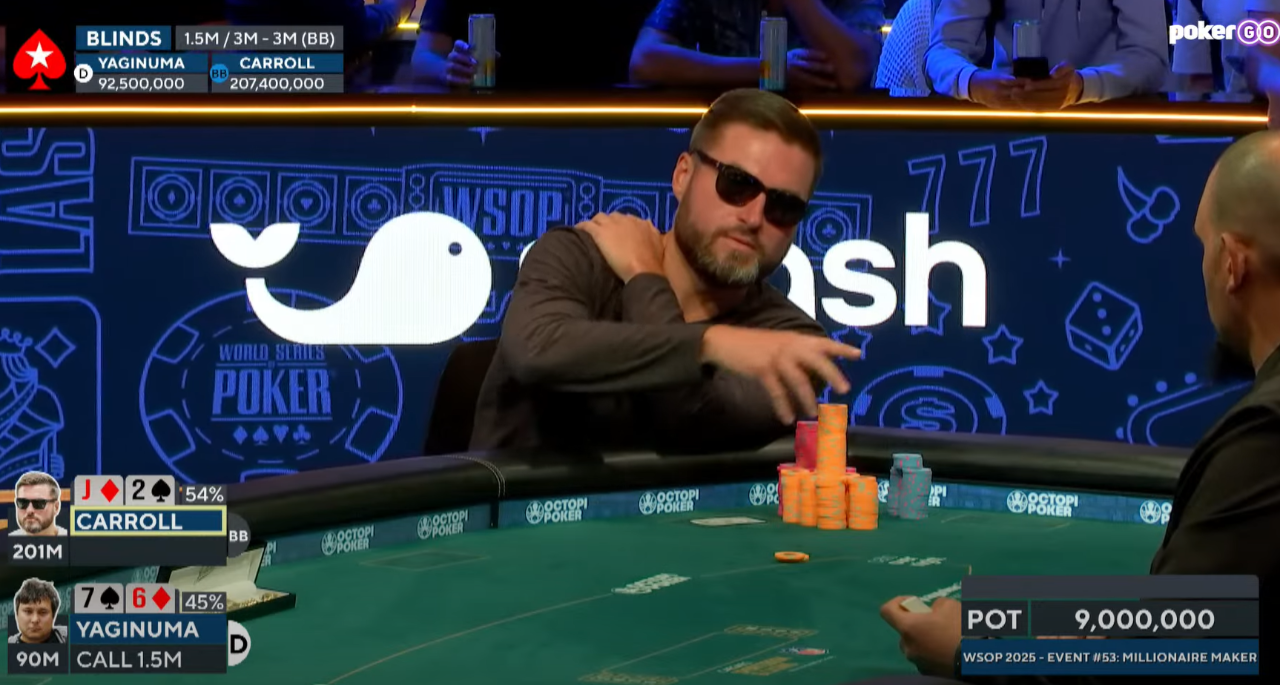 前两天,Jesse Yaginuma赢得了1500美元的百万富翁制造者赛事,因此额外赢得了WPT俱乐部黄金的100万美元奖金,这是作为一项特别促销的一部分。这立即引起了人们的怀疑,因为他的单挑对手James Carroll似乎在“传码”给他。尽管以极短的记分牌进入单挑,Yaginuma还是设法取得了领先,尽管他从未为了比赛的生存而全下。Carroll频繁地加注/弃牌许多弱牌,并且明牌玩他的强牌,甚至在某个时刻直接用口袋A全下。甚至有人说他用奇数金额进诈唬,用偶数金额进行价值下注。