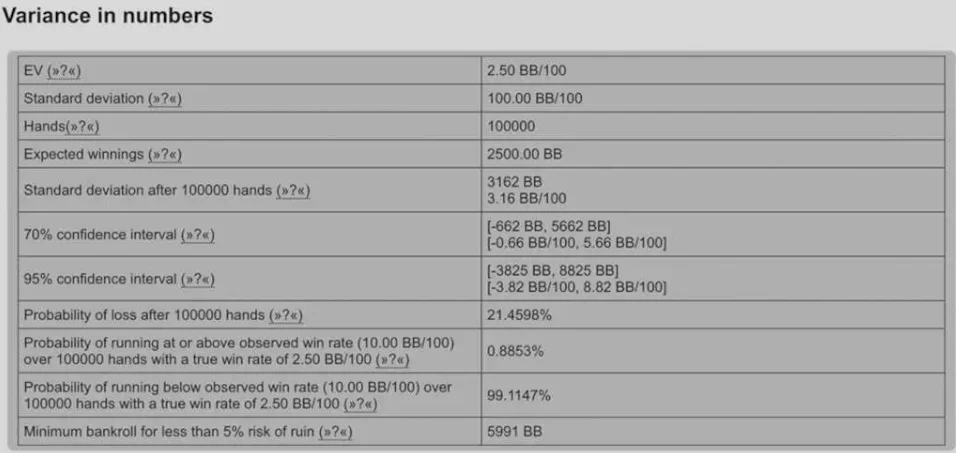 如果你的胜率是每100手牌2.5个大盲注,你需要大约6000个大盲注的记分牌才能避免破产。如果你玩的是NL100(买入100美元,1美元大盲注),这意味着你需要6000美元的记分牌。