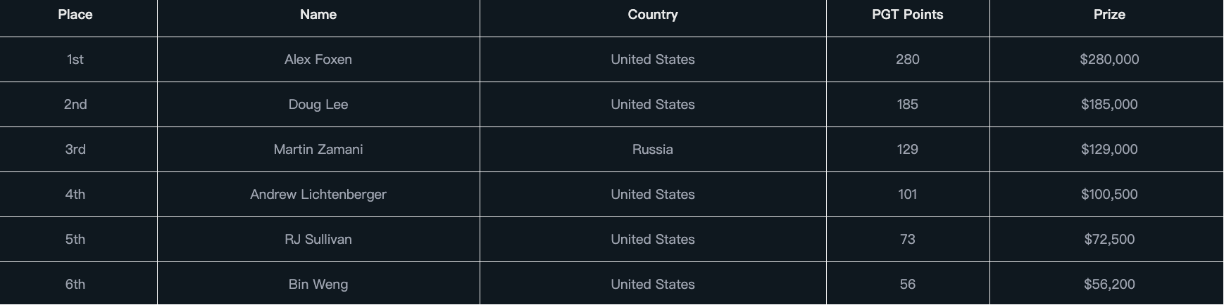 这场是扑克大师赛第六站,109人参赛、总奖池$1,090,000,Foxen直接抢下最大份奖金,还把现任世界冠军Michael Mizrachi挤下去,成了2025 年PGT积分榜第一。