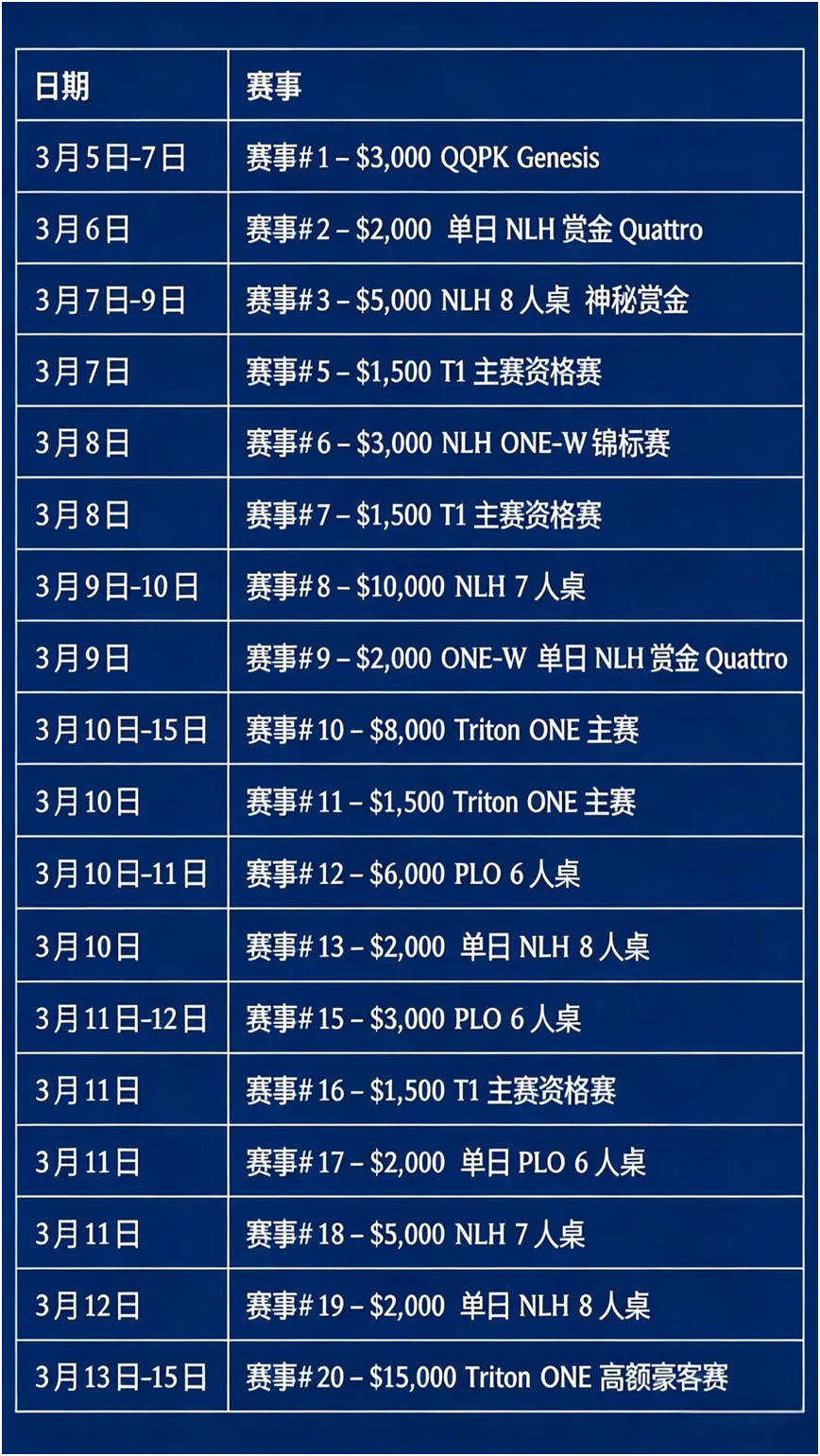 3月6日,Triton ONE迎来了第二个比赛日,济州神话世界Les A Casino内热度不减,三场精彩赛事同步上演,既有QQPK Genesis剩余轮次的激烈角逐,更诞生了本届赛事的首个冠军,中国选手不负众望,用实力书写荣耀时刻。